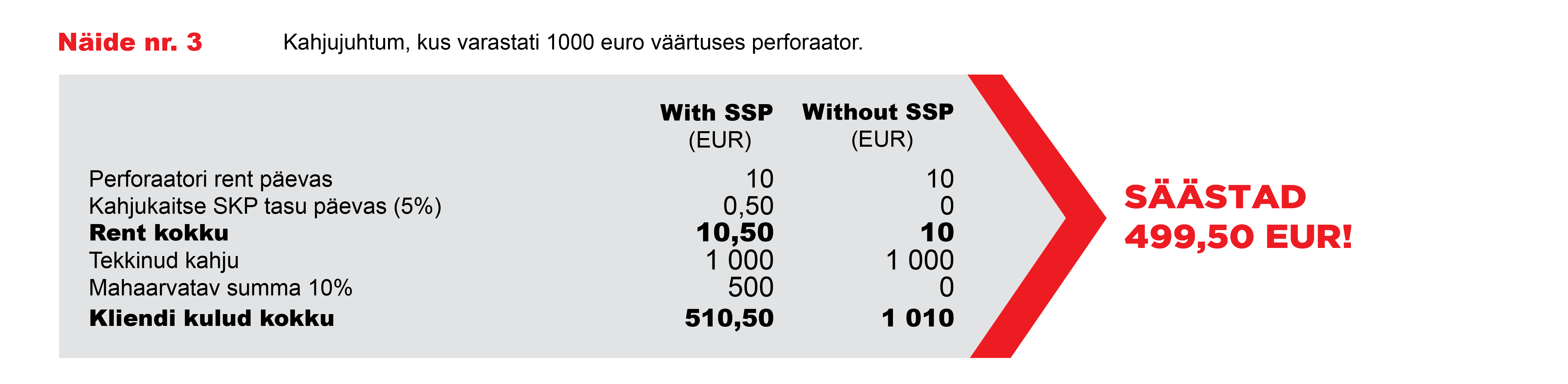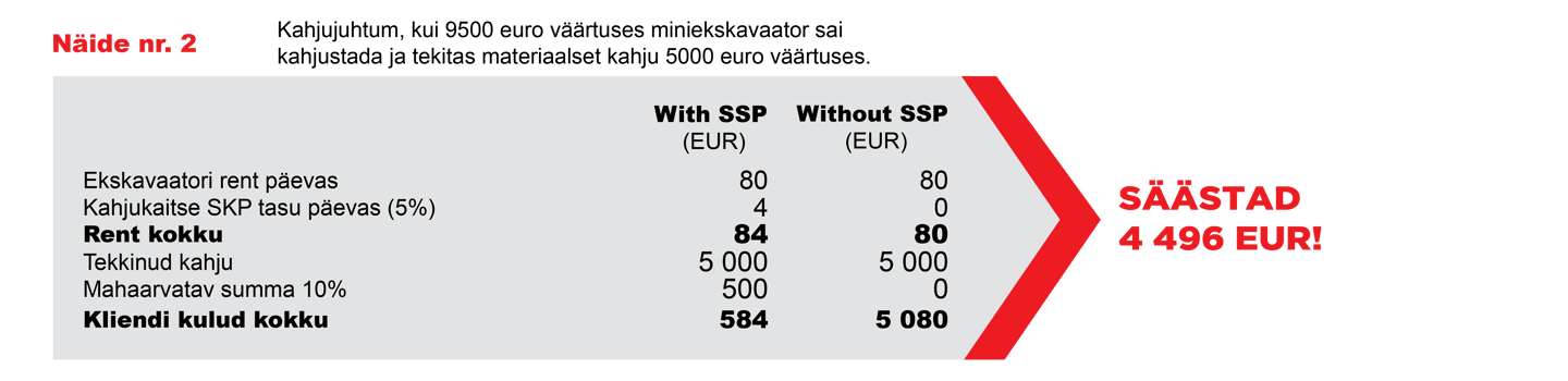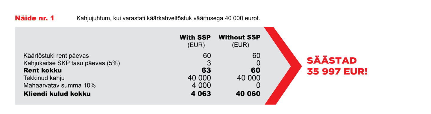 Kahjujuhtumi korral ja SKP kasutamise korral maksate rendileandjale ainult omavastutuse, mis on 10% kahju summast, kuid mitte vähem kui 500 eurot kuni 10 000 euro väärtusega seadmete puhul ja mitte vähem kui 1500 eurot üle 10 000 euro väärtusega seadmete puhul.
