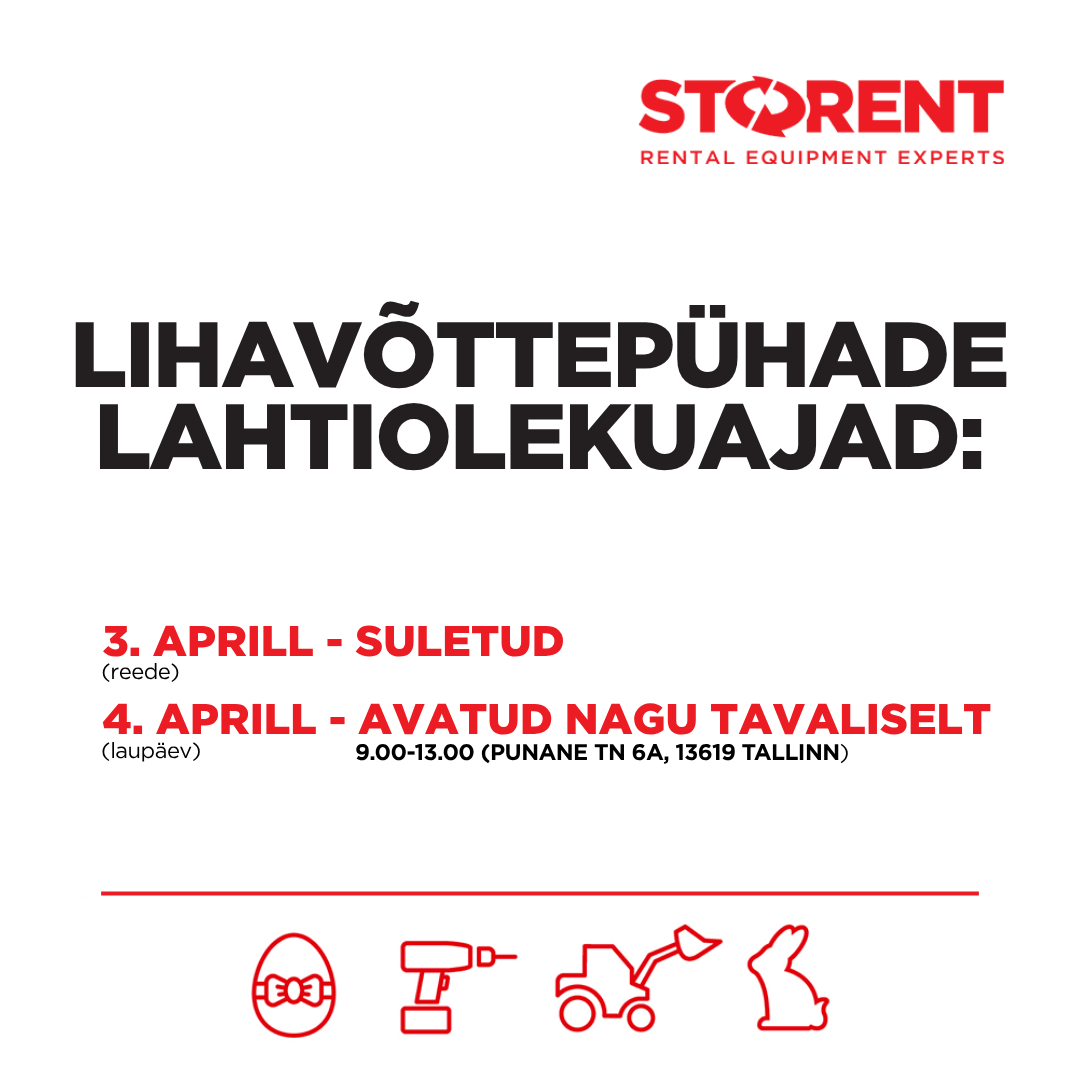 <h4 style="text-align:center;">Kallid kliendid, palun pöörake tähelepanu tööaja muudatustele lihavõttepühade ajal!</h4><figure class="image image_resized" style="width:77.3%;"><img style="aspect-ratio:1080/1080;" src="https://images.storent.com/pw-public/EE/cms/Darba laiks Storent (5).webp" width="1080" height="1080"></figure><figure class="image image_resized" style="width:80.23%;"><img></figure>